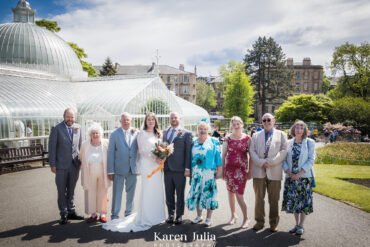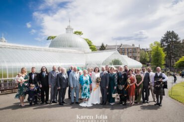 There's plenty of choice when it comes to wedding day group photos in the Botanic Gardens. The space outside the entrance is perfect to eith have Kibble Palace or the gardens as the backdrop. If the weather is too cold or wet, theninside is warm and cosy, with space for group photos just inside the entrance, or deeper within Kibble Palace.